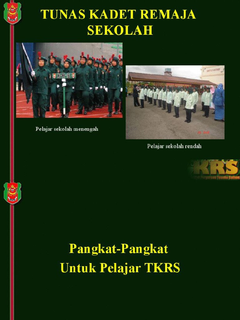 Tunas Kadet Remaja Sekolah Pakaian Tkrs Ada tentera berpangkat kolonal pegawai2 dan anggota pangkat rendah. Antara tujuan TKRS ditubuhkan adalah untuk memberikan pendedahan awal. KadetPelajar RendahTunas Kadet pelajar sekolah rendah ataupun dikenali sebagai Tunas KRS memakai tanda pangkat atas poket kanan baju.
